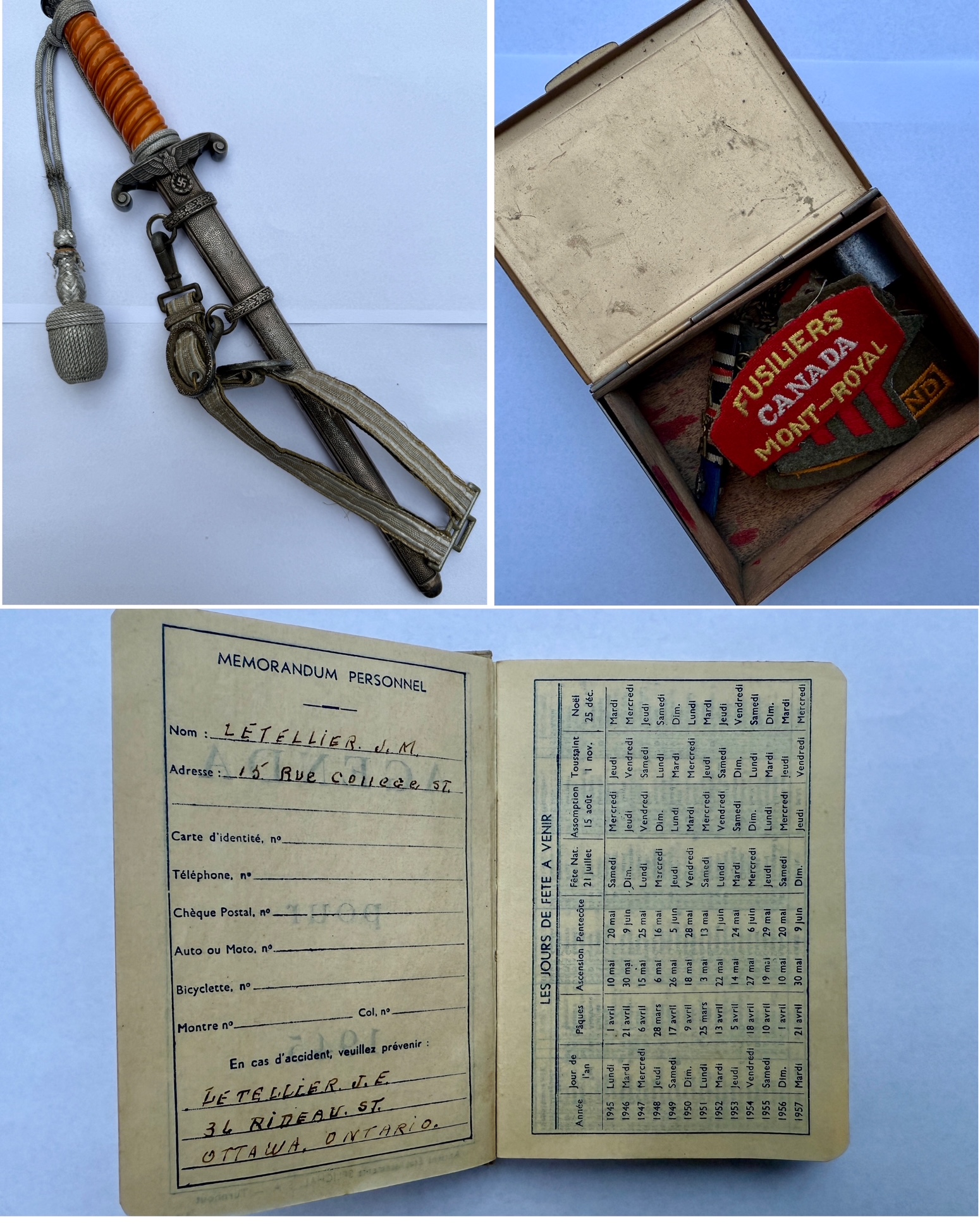 De buitgemaakte Wehrmacht officiersdolk, vergezeld door een doosje met Canadese emblemen – waaronder het regimentsembleem van het Les Fusiliers Mont Royal – en de zakagenda uit 1945 van de Canadese veteraan J.M. Letellier. © collectie Joël Stoppels