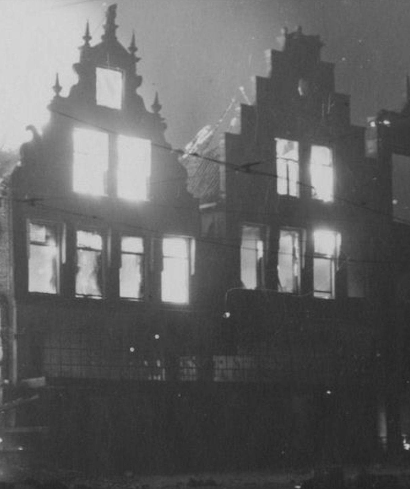 In dat gebouw waren tijdens de oorlog honderden Nederlanders gemarteld; nu vlamde het op als een symbool van het einde van de bezetting. Rook, explosies en instortende gevels bepaalden het beeld. In de Oude Ebbingestraat gingen twintig winkelpanden verloren. Ooggetuigen meldden dat in burger geklede SS’ers zich tussen de bevolking bewogen, brandstichtten en uit hinderlagen schoten. Eén van hen werd betrapt en door Canadezen zonder pardon neergeschoten. Ondanks alles bleven burgers, brandweerlieden en hulpverleners zich tussen de gevechten bewegen. De Groningse brandweer hield onder beschieting het Goudkantoor nat en voorkwam dat dit rijksmonument verloren ging.