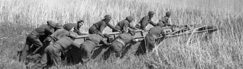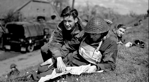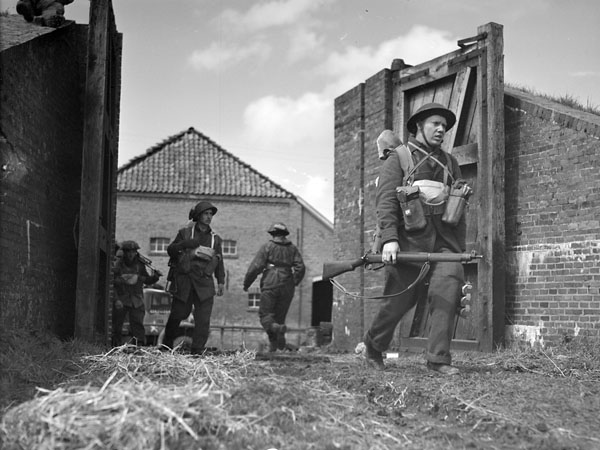 Canadese militairen van The Highland Light Infantry of Canada maken zich klaar voor de oversteek over de rivier de Eems op 28 april 1945. Foto: Library and Archives Canada.