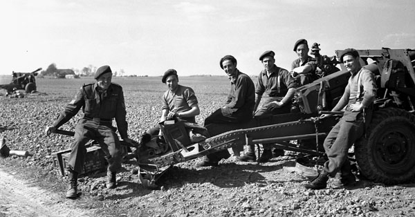 Militairen van de Royal Canadian Artillery (R.C.A.) poseren met hun 25-pounder kanon langs de Eems ten zuiden van Emden. Foto: Library and Archives Canada.